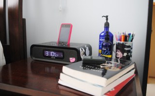 | My bedside table on one of the better days. Every other day of the week there is at least two water bottles and a coffee mug on top. My Winston Churchill mug, my books, and my chamomile sleep lotion – definite favorites. Also notice the very seventh grade-esque stickers I put on the sides of my iHome. So much regret. |