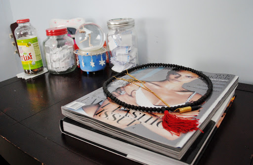 | My desk that doubles as my jewelry table is basically a place to set things down until they have a home. I usually keep any current magazines (note the Cara Delevingne cover of W Magazine) on top of my Lady Gaga book. I have jars upon jars on the corner. One jar has fortunes from fortune cookies, one has spare change, and one has happy notes from throughout 2013. I’m so sentimental it makes me gag. |