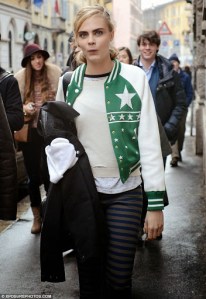 Out and about, Cara wears a green, varsity jacket paired with navy and taupe striped pants. Under the jacket she wears a cream sweater over a grey flecked t-shirt. Cara mixes a sporty style with the varsity jacket with the more reserved style of her pants. Cara tends to mix patterns and colors in unusual ways to create a unique and distinct style.