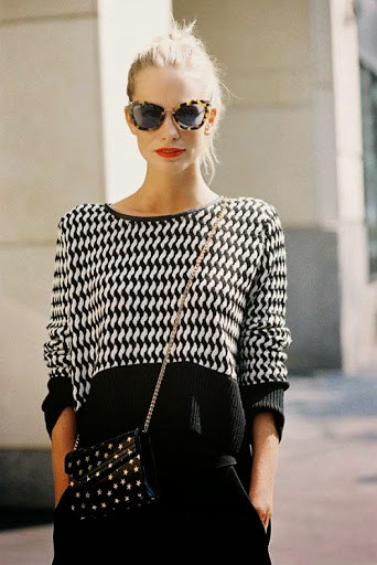 Poppy takes a chic route with black and white. She mixes the pattern of the sweater with the black and white star pattern of her bag. She adds tortoise-shell sunglasses and a bright red-orange lip color to contrast the outfit.