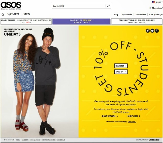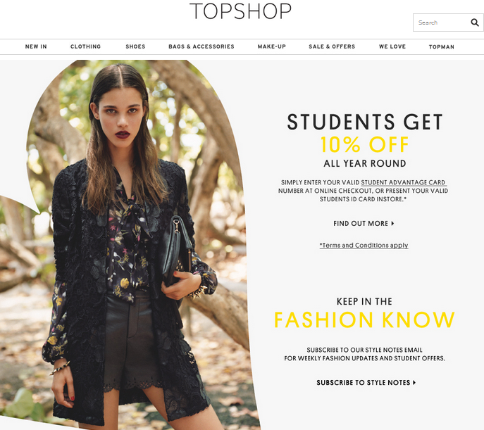 In about seven short weeks I will be making the transition from living at home to becoming a full-time college student. Aside from the immense amount of excitement that brings me, it also brings me tremendous amounts of anxiety. The number one cause for concern in my case is in regard to my wardrobe. I have more clothes than I need, and I also continue buying clothes at an exponential rate. I am clearly a shopaholic, but I don’t necessarily see that as a bad thing, at least not all the time. One of my biggest concerns is how I will keep up with my shopping habits while I am at school studying. I will have to rely on money I have saved for at least the first semester, since I don’t plan on looking for a job until second semester. Unfortunately, the money I have saved doesn’t all get to go towards building my closet, it also has to apply towards food, excursions, and other things here and there. With this daunting issue, I have decided to compile a list of places that offer discounts to college students – and sometimes even high school students! Most of these offers require a student ID card or your university affiliated student email address. Even though some of these discounts may not seem like much, remember that pennies saved can add up to larger amounts in the long run depending on your spending habits. Of course it is good to try and cut back and set up a budget, but this list is meant to give you that extra discount when you just can’t resist the cute shirt from ASOS. There are many lists like this out there on the internet that you can find, but here are some of my suggestions: