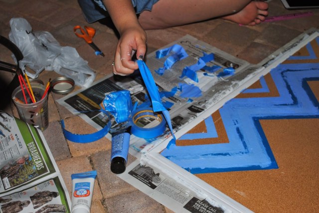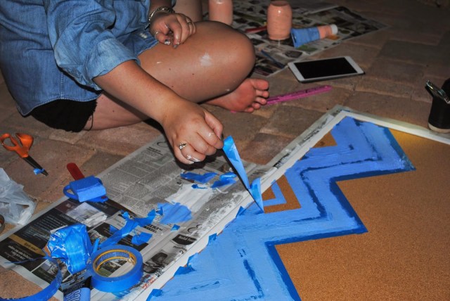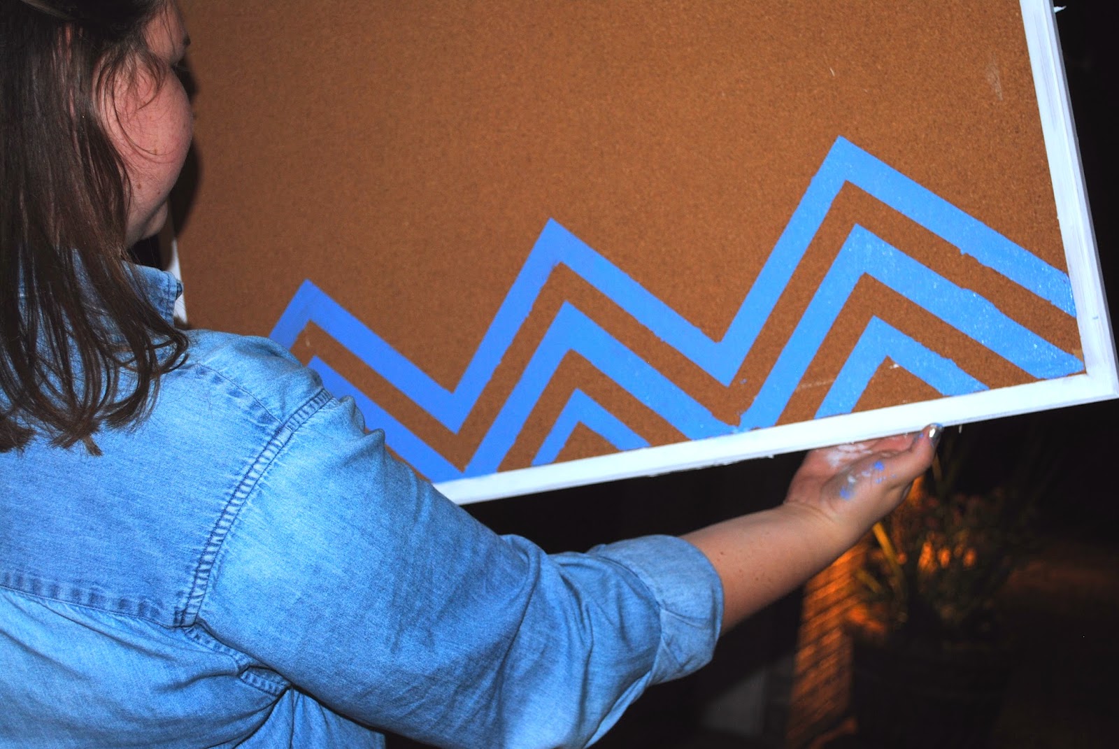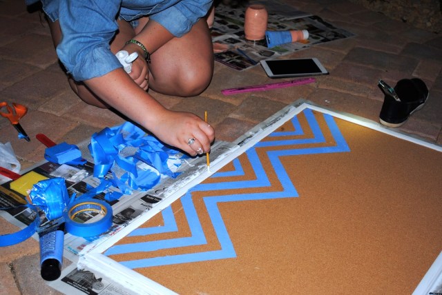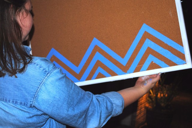 2. Begin by taping around the inside edges of the cork board so you don’t get paint on it while you are painting the border. Be careful while taping the cork board because I found that with my board specifically, the cork was thin and didn’t adhere well to the backing, causing the tape to rip up some chunks of cork when the tape was removed.