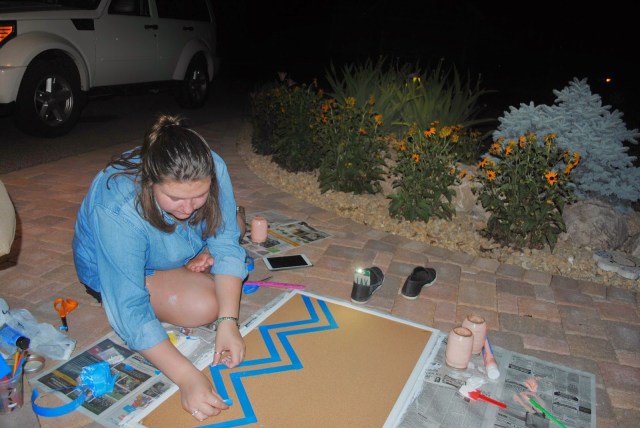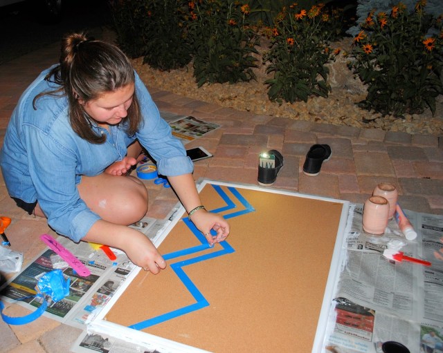 1. Supply run to Michael’s Craft store. Here’s what you need: standard cork board (mine was roughly 2′ by 3′ and cost $17), acrylic paint in your desired color(s), tape, scissors, ruler, and paint brushes.