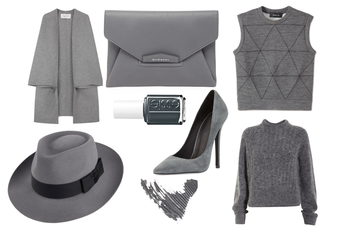 Here are some of my favorite ways to wear grey this season. Obviously I love the over-sized coat trend, so I’m a sucker for this Valentino one. This Acne sweater looks so cozy and would match with just about anything imaginable. Other ways to incorporate grey into your wardrobe can be through accessories like this Givenchy clutch, these Jeffrey Campbell pumps, or a grey felt hat. You can also be subtle with charcoal grey nail polish, which is so chic!
