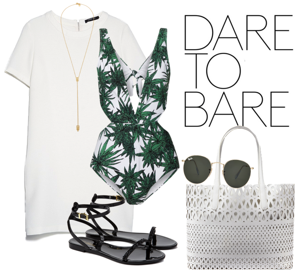 I think I would have to say that this is my favorite of the three outfits because it is so perfect. One pieces are super on trend currently and the nice thing about them is that they are perfect outfit builders. Throw on a pair of denim cutoffs and you’re set. I wanted to put together something just as simple but a little more unique. Pair a patterned one piece or other swimsuit with a white t-shirt dress. If the dress is less opaque, you may be able to see the pattern peeking through which can look super cool. White is a good color to for though since it reflects light and will keep you cool. Add simple accessories like these minimalistic black strappy jelly sandals. These are perfect for the beach or pool because even if they get wet, there is nothing to worry about. A tote bag is a beach and pool-side essential so go for one that fits all your necessities but is still versatile and cute like this white laser cut one. If you really want to jazz up your outfit for a pool party or something a little more “formal” than a casual pool hang out, add a simple necklace like this gold lariat necklace and a pair of unique sunnies to top it all off.