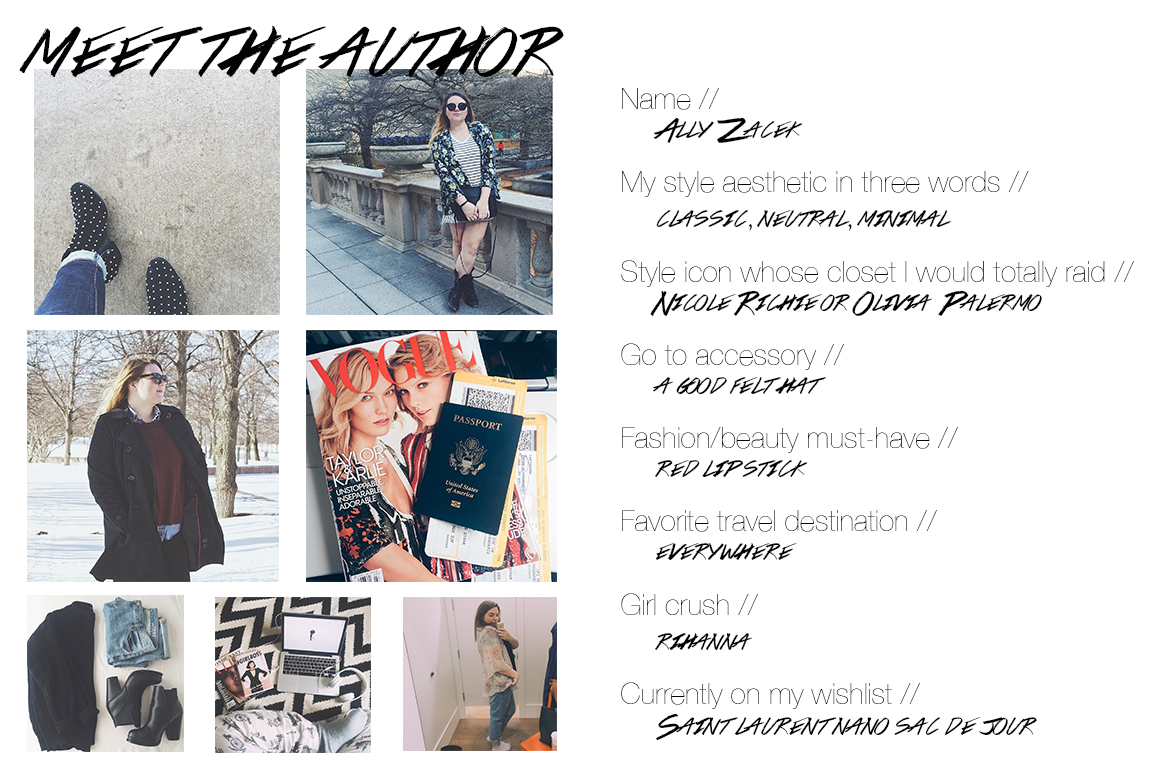 Hello, and welcome to my blog. I’m Ally Zacek, and to describe myself is a daunting task. I am a writer, learner, creator, and fashion fanatic. My passions include Macaroni and Cheese pizza, searching for the next best indie rock song, and downing innumerable cups of black coffee.